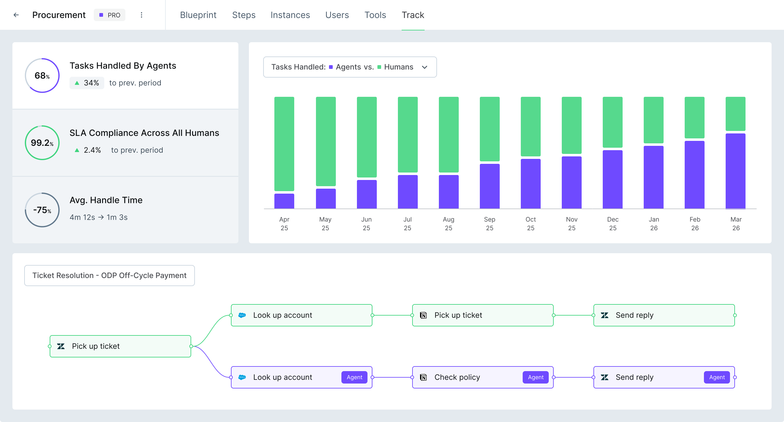 WIQ tracks the same metrics for agents as it does for humans: handle time, SLA compliance, conformance to the blueprint, and deviation detection. You can compare agent and human performance side by side across any process.