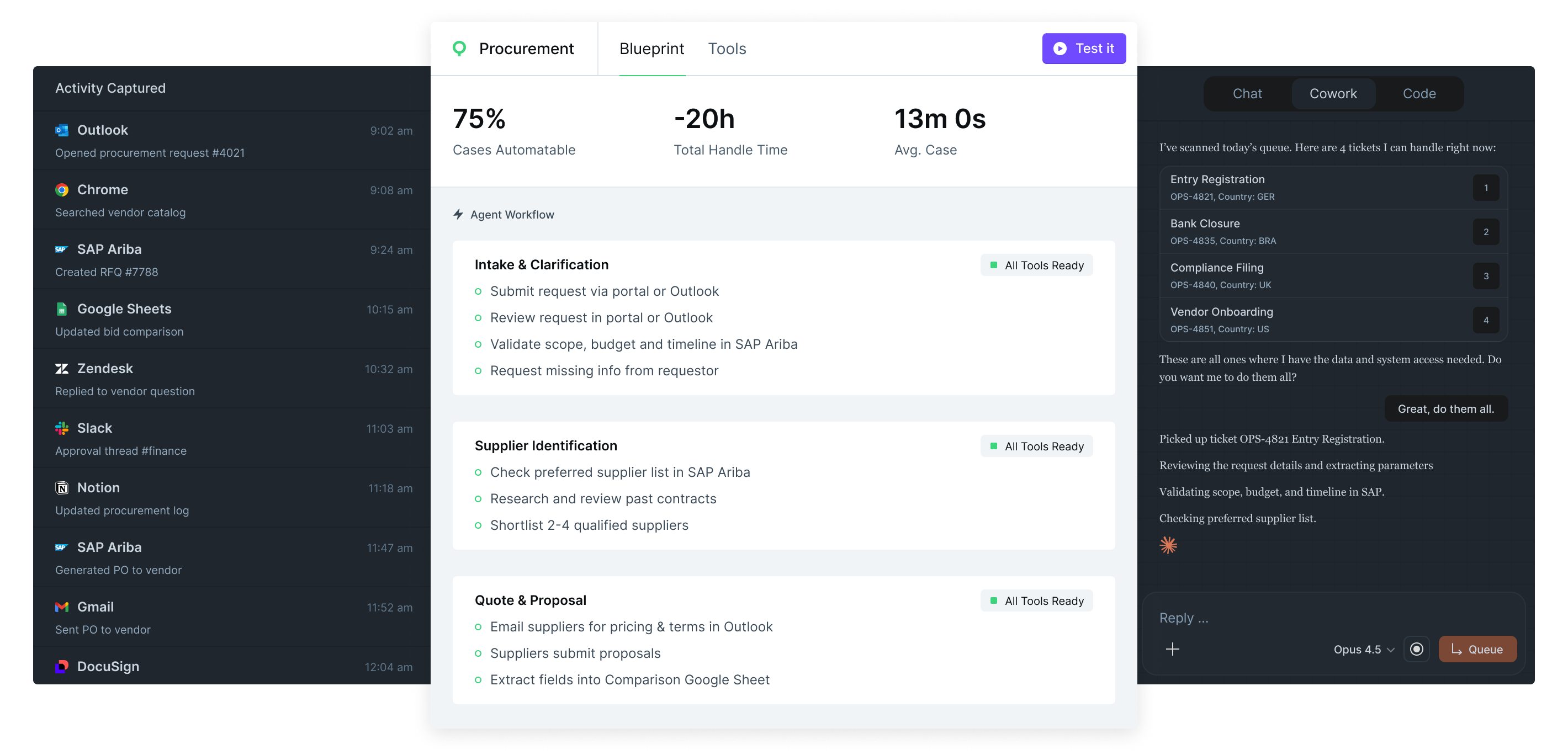 A blueprint is a complete automation spec generated from observed human work. It includes structured agent instructions, a list of required tools and integrations, guardrails, escalation paths, and human checkpoints. Blueprints are designed to be deployed directly into an agentic platform.