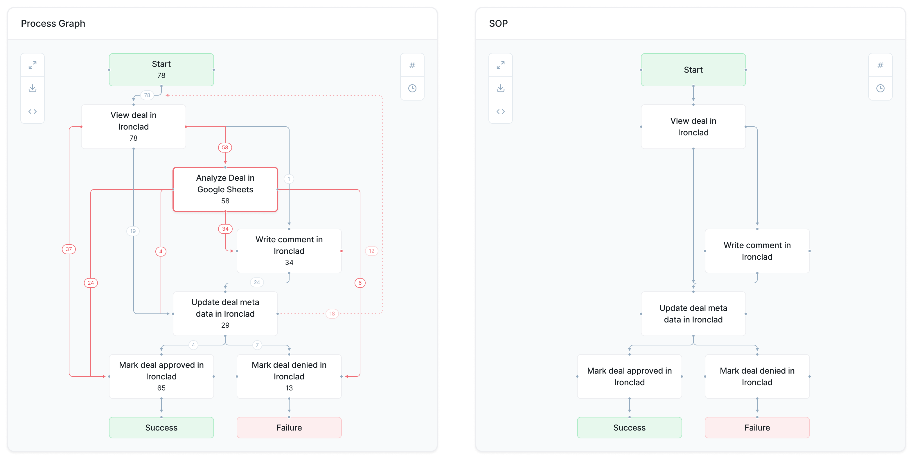WIQ correlates process patterns with your business metrics—like conversion rate, resolution time, or error rate—so you can see which variants produce the best results. Redesign your workflows based on what actually works, not what you assume should work.